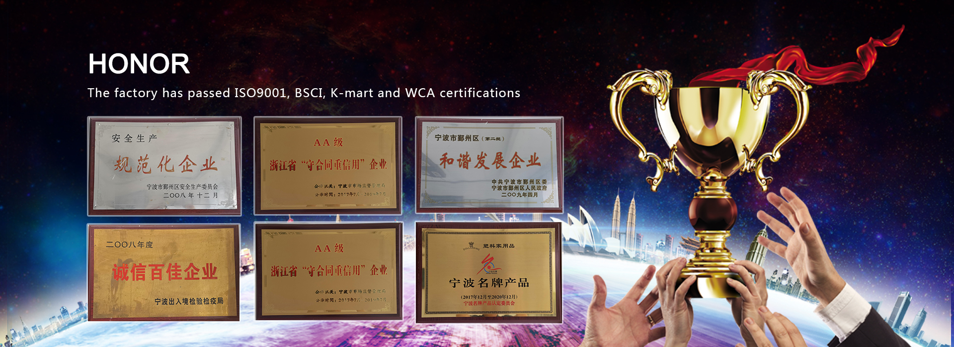 we have been certificated by ISO9001, BSCI, K-mart and WCA.